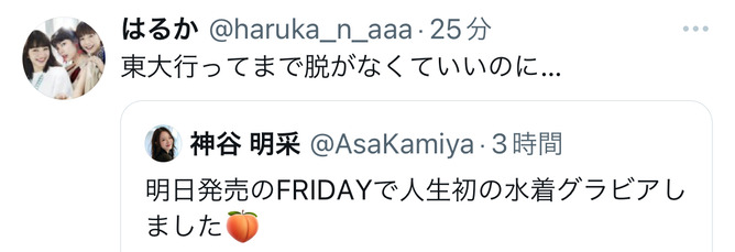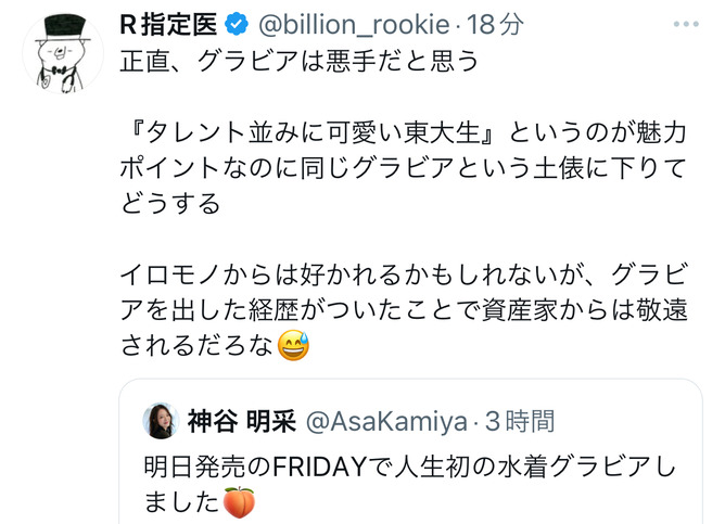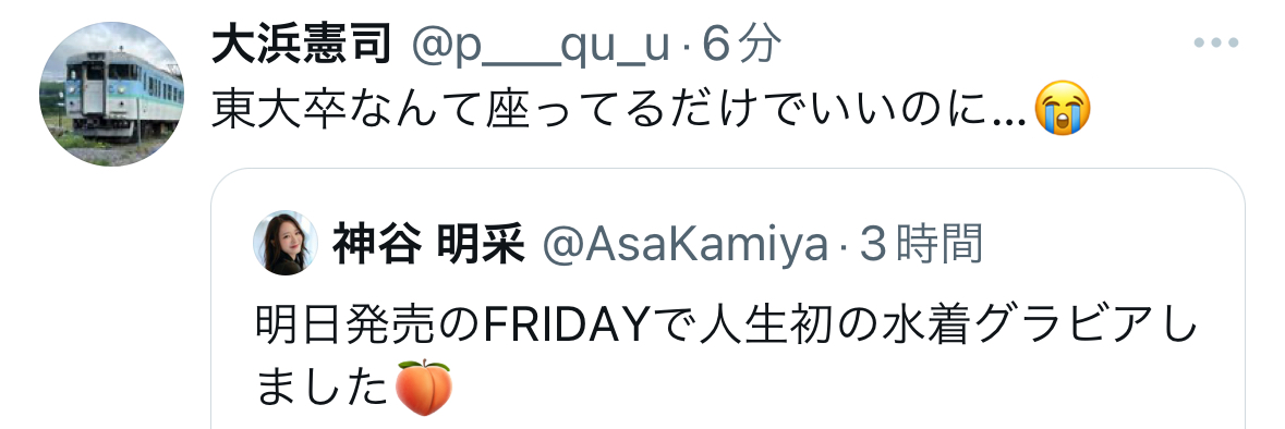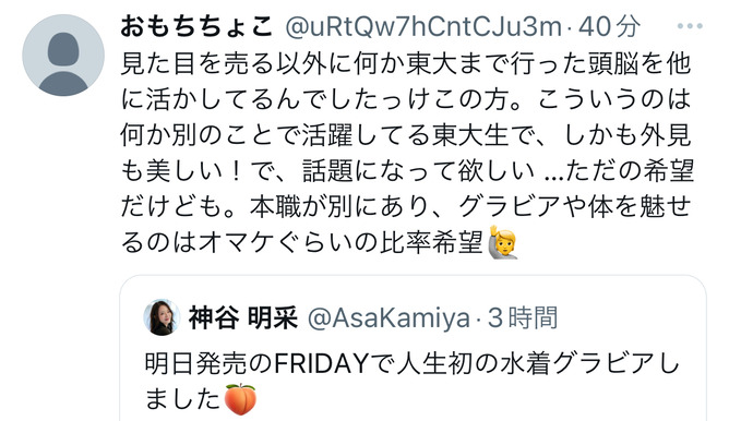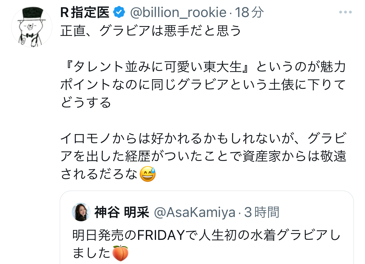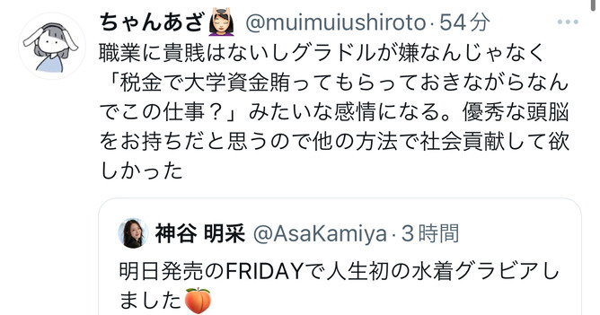 東大に行くのはただの権利で職業の選択の自由なんやし東大行ってまでグラビアなんてって主張はどちらも選べなかったやつの嫉妬でしかない