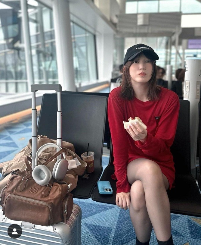本田は「雑誌の撮影で韓国へ」とつづり、1枚の写真をアップ。赤いワンピースに黒のブーツをあわせたコーディネートで、足を組み座ってサンドイッチをほおばる様子がとらえられている。