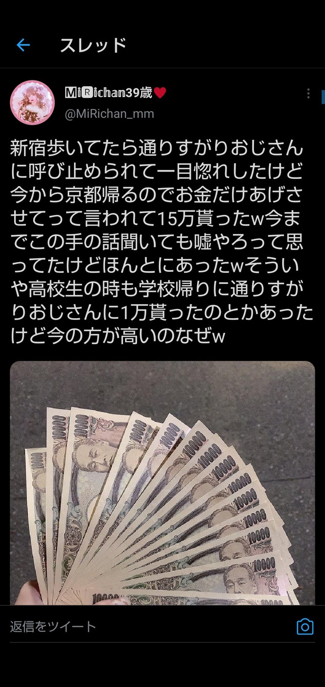 17、8歳の時に失踪してるうちの息子に似てるとおばちゃんに声をかけられて5000円貰ったことがあるわ
