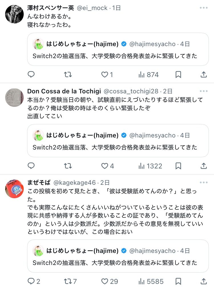 「受験舐めるな!」とか「俺は受験のときこれだけ緊張した!」みたいなのは気持ち悪いな
