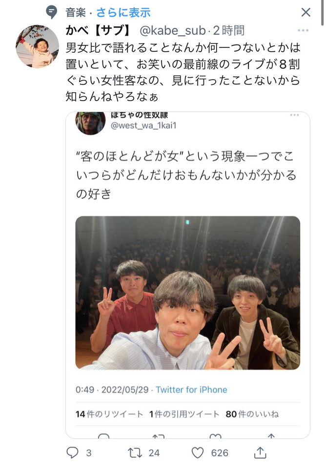 男女比で語れることなんか何一つないとかは置いといて、お笑いの最前線のライブが8割ぐらい女性客なの、見に行ったことないから知らんねやろなぁ pic.twitter.com/0Gu6xjB3zh